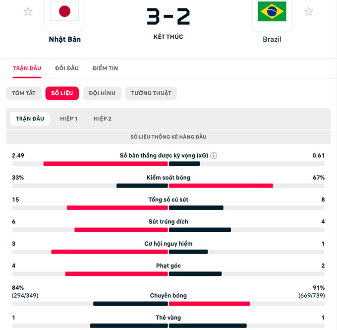 Sau giờ nghỉ giải lao, Brazil bất ngờ sụp đổ trong 25 phút sau những sai lầm của hàng thủ. Minamino, Nakamura và Ueda là những người lập công giúp Nhật Bản tạo nên cú lội ngược dòng lịch sử. Trong đó, cầu thủ vào sân thay người Junya Ito tỏa sáng với cú đúp kiến tạo.
