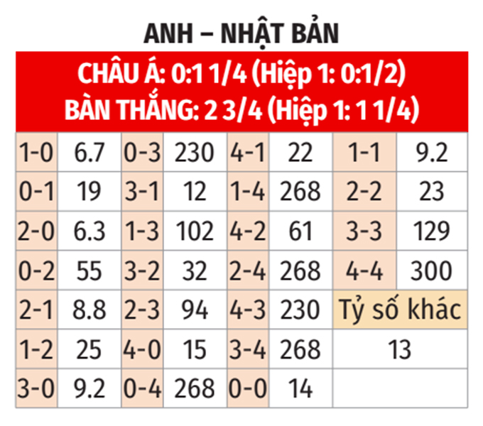 - Hiệp 1 tối đa 1 bàn: Cả 3 trận gần nhất của Anh và 7/9 trận vừa qua của Nhật Bản có nhiều nhất 1 bàn trong hiệp đấu đầu tiên. Ngoài ra, 10/12 trận sân nhà gần đây của Anh và 6/8 chuyến làm khách vừa qua của Nhật Bản cũng khép lại hiệp 1 với nhiều nhất 1 bàn.