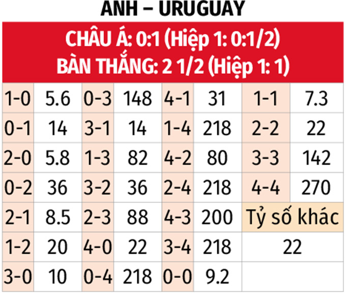 - Chờ Anh giảm nhường 3/4: Tuyển Anh đang có mạch 5 trận liên tiếp thắng châu Á. Ở chiều ngược lại, Uruguay chỉ thắng châu Á 1/5 trận vừa qua (3 thua, 1 hòa). Với sàn châu Á nhường 1 trái, có thể chờ giảm về 3/4 để đặt niềm tin vào Anh.