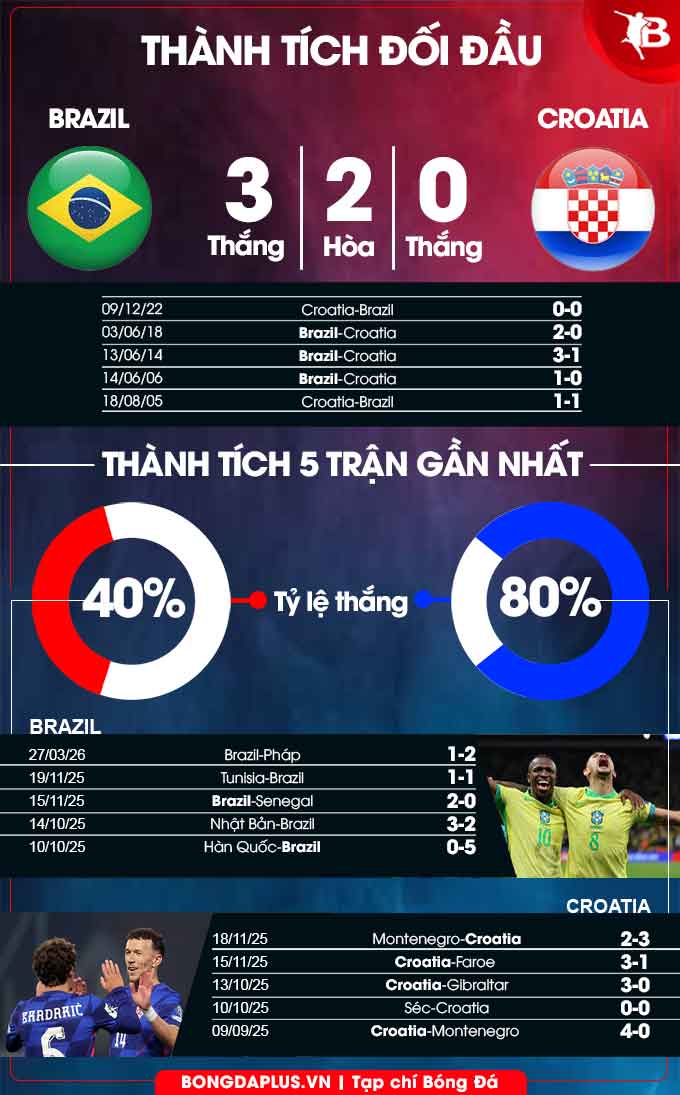 - Hai đội đều ghi bàn: Brazil ghi bàn ở 7/8 trận đấu gần đây. Croatia cũng “nổ súng” ở 8/9 trận gần nhất.