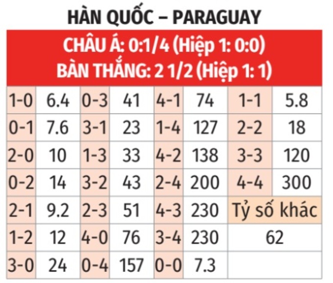 - Tối thiểu 1 bàn hiệp 1: 3/4 lần gặp giữa 2 đội gần đây đều có từ 1 bàn thắng trở lên trong hiệp 1. 7 trận gần đây của Hàn Quốc và 4/5 trận sân khách vừa qua của Paraguay tương tự.