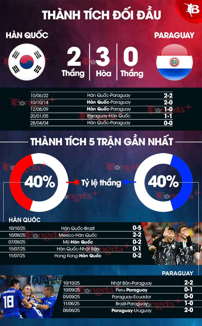Đặc biệt, Hàn Quốc có sự ủng hộ của lịch sử. Thống kê cho thấy, trong 5 lần chạm trán giữa 2 đội gần đây, đội bóng xứ sở Kim chi áp đảo Paraguay. Cụ thể, họ thắng 2 và hòa 3 trận. Trong đó, cả 2 chiến thắng của Hàn Quốc đều diễn ra trên sân nhà.