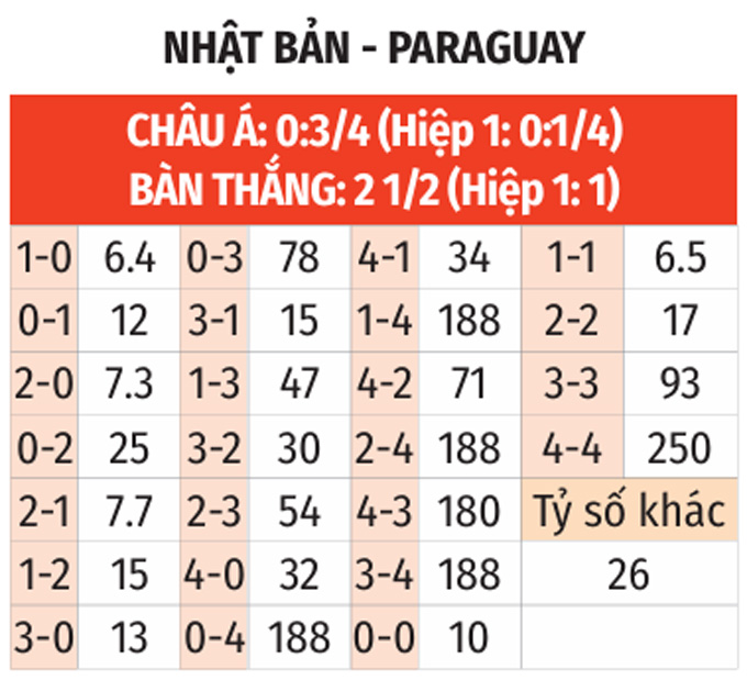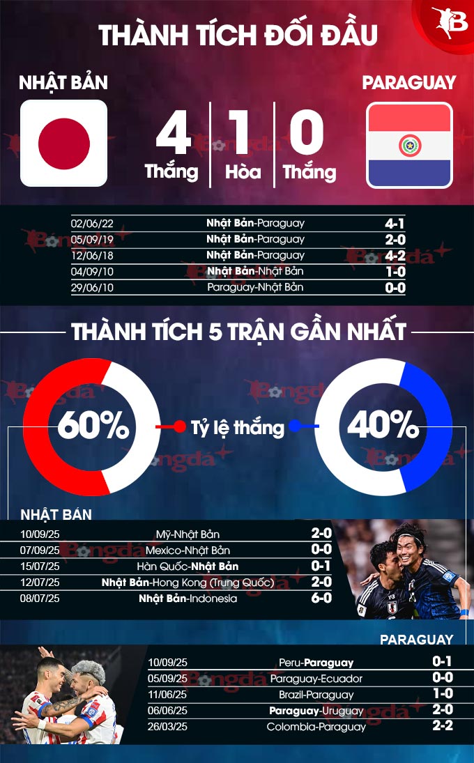 - Lưới rung 25 phút cuối: 2/3 trận đối đầu gần đây giữa Nhật Bản và Paraguay có bàn thắng từ phút 65 trở đi. Chưa hết, 3/5 trận chính thức vừa qua của Nhật Bản và 2/3 trận vừa xong của Paraguay cũng chung kịch bản.