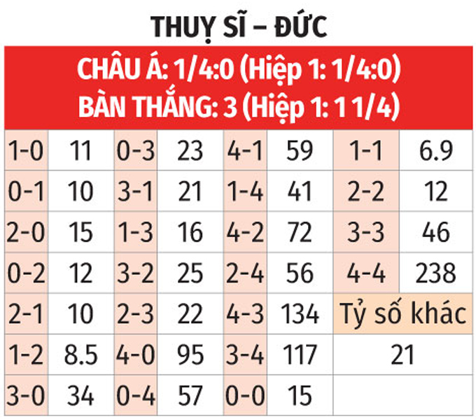 - Hiệp 1 có bàn thắng: 7/8 trận vừa qua của Thụy Sĩ có bàn thắng trong hiệp 1. Bên cạnh đó, 5/6 trận gần nhất của Đức cũng chung kịch bản.