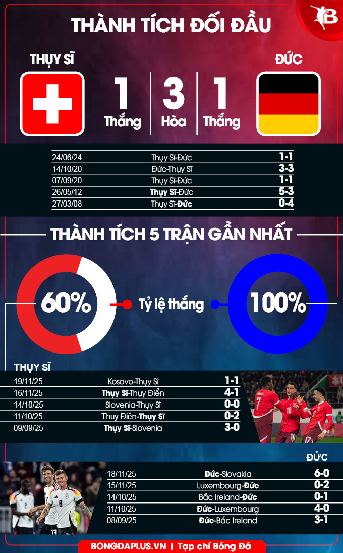 - Hai đội cùng ghi bàn: Thụy Sĩ thành công trong việc ghi bàn ở 9/10 trận gần đây, còn với Đức là 8/10 trận vừa qua. Bên cạnh đó, Thụy Sĩ ghi bàn ở 7 trận gần nhất trên sân nhà, còn với Đức là ở 6/7 trận sân khách gần đây. Với xu hướng như vậy, khả năng cao hai đội sẽ cùng tìm được đường vào khung thành của nhau.