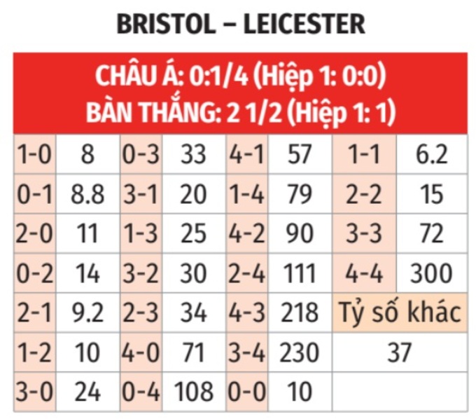 - Lẻ bàn thắng: 5/7 lần gặp giữa 2 đội gần đây có từ 1 bàn trở lên trong hiệp 1. Tình trạng tương tự xảy ra tại 3/4 trận gần đây của Bristol và 4/5 trận mới nhất của Leicester.