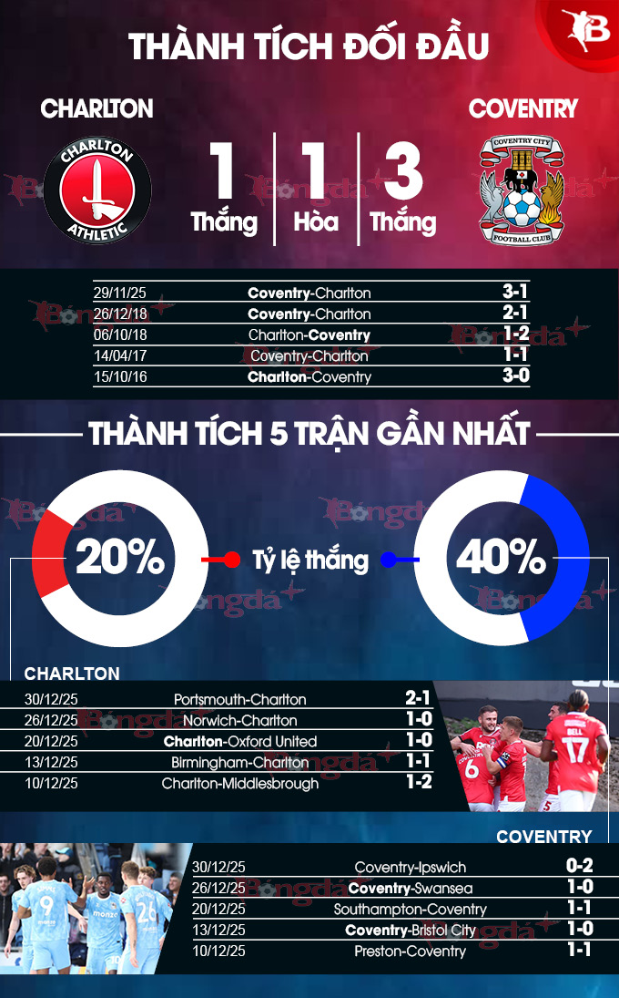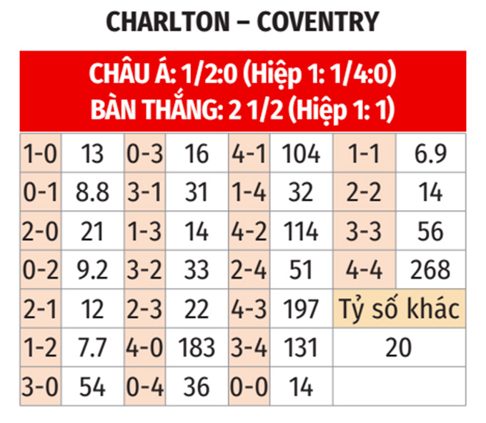 - Từ 3 bàn trở lên: 6/8 cuộc đối đầu gần nhất, 5/8 trận gần đây của Coventry và 9/12 chuyến làm khách vừa qua của Coventry đều khép lại với ít nhất 3 lần lưới rung cả trận. Ngoài ra, cả 4 trận đụng độ gần đây tại Charlton cũng chứng kiến tối thiểu 3 bàn cả trận.