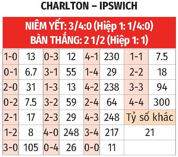 - Từ 2 đến 3 bàn: 5/6 trận gần đây của Charlton cùng 3/4 trận vừa qua của Ipswich đều có từ 2 đến 3 bàn thắng được ghi. Kịch bản này cũng diễn ra ở 2 trận đối đầu gần nhất giữa đôi bên.
