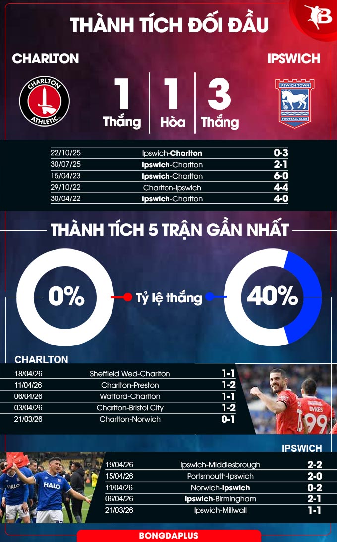 - Chẵn bàn thắng: 7/8 trận gần đây của Ipswich cùng 2/3 trận vừa qua của Charlton đều có tổng bàn thắng là chẵn. Kịch bản chẵn bàn thắng cũng diễn ra ở 6/8 trận đối đầu gần nhất.