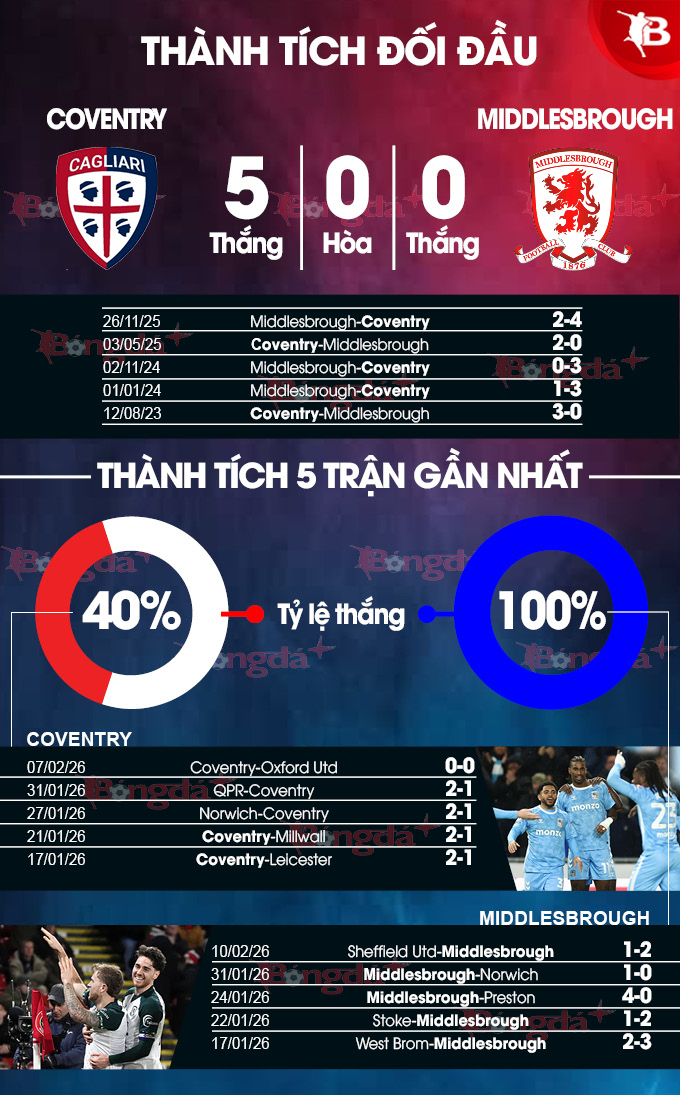 - Nhiều bàn thắng: 4/5 trận gần đây của Coventry cùng 6/7 trận vừa qua của Middlesbrough đều có từ 3 bàn thắng trở lên. 4/5 trận đối đầu gần nhất cũng có thống kê tương tự.