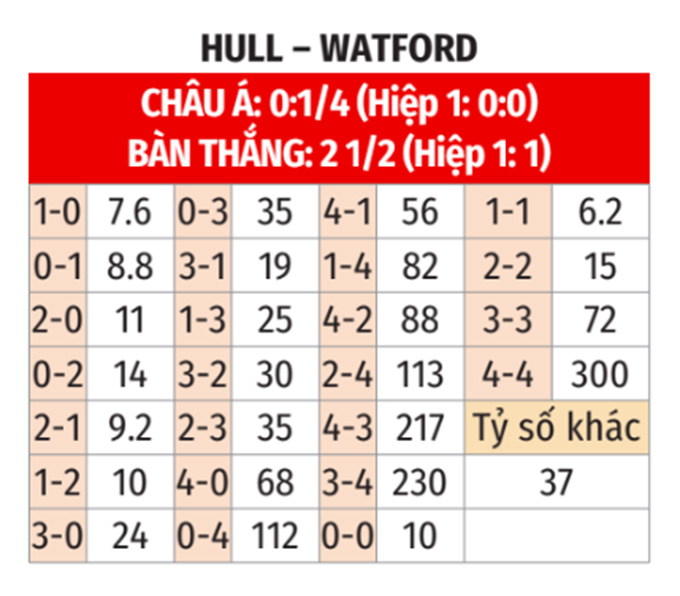 - Lẻ bàn thắng: 6/10 cuộc đối đầu gần nhất, 6/7 trận gần đây của Hull và 4/6 trận sân khách vừa qua tại hạng Nhất Anh của Watford đều khép lại với tổng bàn thắng là lẻ. Ngoài ra, 7/10 cuộc đối đầu gần nhất tại Hull cũng có tổng bàn thắng không chi hết cho 2.