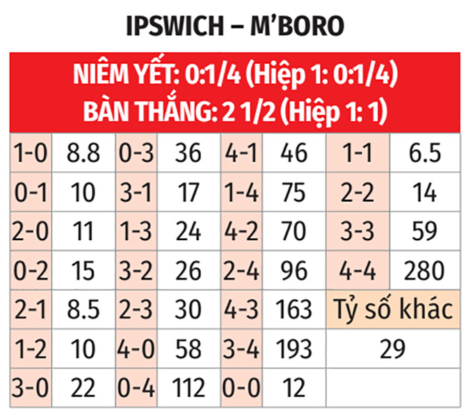 - Ipswich Town thắng hiệp 1 theo niêm yết: Ipswich Town thắng hiệp 1 theo niêm yết ở 3/4 trận gần đây. Đá với Middlesbrough thua hiệp 1 theo niêm yết ở 5/6 trận gần nhất, đội chủ nhà là sự lựa chọn đáng tin trước giờ nghỉ.