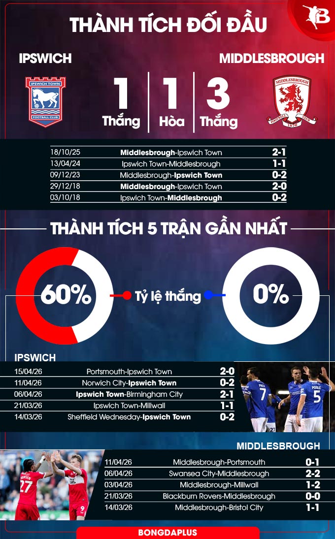 Tuy nhiên, không thể xem thường đội khách khi họ đã kiếm 36 điểm sân khách mùa này, chỉ kém Millwall (37). Thậm chí, Middlesbrough còn bất bại 4 chuyến làm khách gần nhất tại Portman Road. Dẫu vậy, với phong độ ổn định hơn cùng lợi thế sân nhà, cơ hội chiến thắng của Ipswich Town xem ra vẫn sáng hơn.
