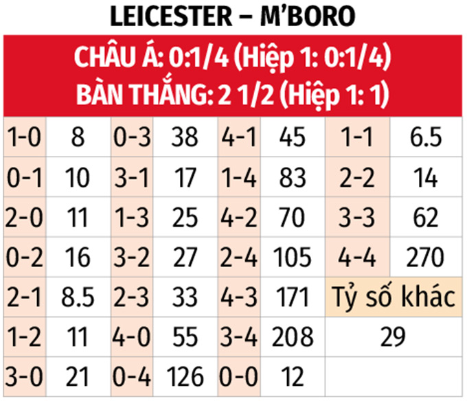 - Ít bàn thắng: 6/8 trận gần đây của Leicester cùng 5/7 trận vừa qua của Middlesbrough đều có tối đa 2 bàn thắng được ghi. Ngoài ra, 4/7 trận đối đầu gần nhất cũng xuất hiện tối đa 2 pha làm bàn.