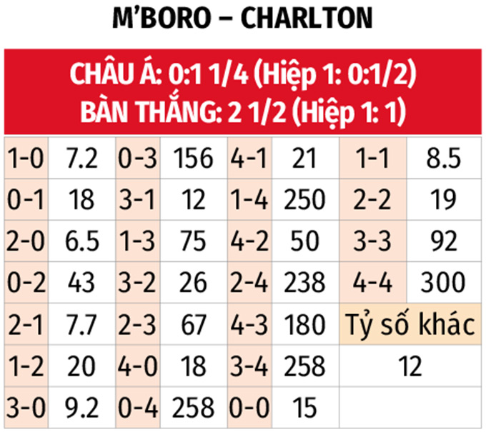 - Middlesbrough thắng châu Á hiêp 1: Lịch sử đối đầu chứng kiến Boro toàn thắng châu Á hiệp đầu tiên ở 3 trận đối đầu gần nhất. Middlesbrough bước vào trận đấu này với 2 trận gần đây toàn thắng châu Á hiệp một. Trong khi đó, Charlton thua châu Á 3, hòa 1 và thắng 1 ở 5 trận vừa qua trong hiệp đầu tiên.