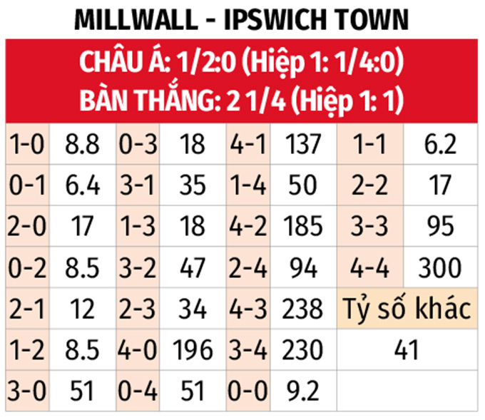 - Millwall thắng châu Á: Các cầu thủ Millwall thắng châu Á 5/7 trận gần đây được chơi trên sân nhà. Với Ipswich, đội khách toàn thua châu Á 3 trận xa nhà gần nhất, trong đó có 1 trận cũng nhường đối thủ 1/2 trái như trận này.