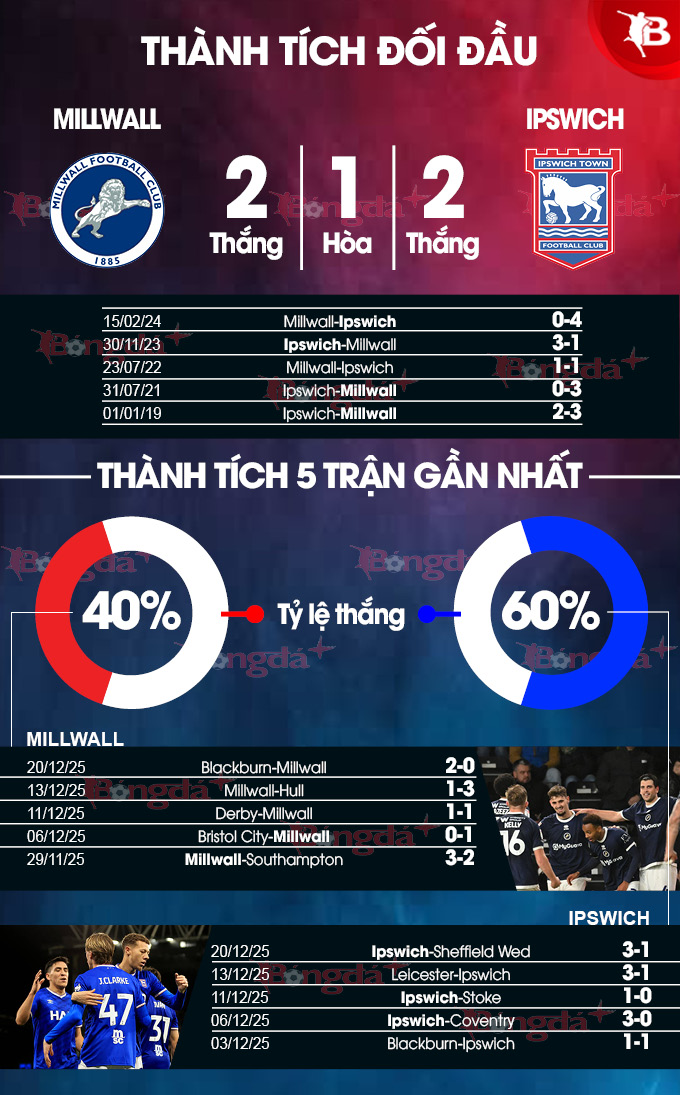 - Nhiều bàn thắng: 2 trận sân nhà gần đây của Millwall cùng 3/4 trận vừa qua của Ipswich Town đều kết thúc với ít nhất 3 bàn thắng được ghi. Lịch sử cũng chứng kiến 8/9 trận đối đầu gần nhất có tối thiểu 3 pha làm bàn.