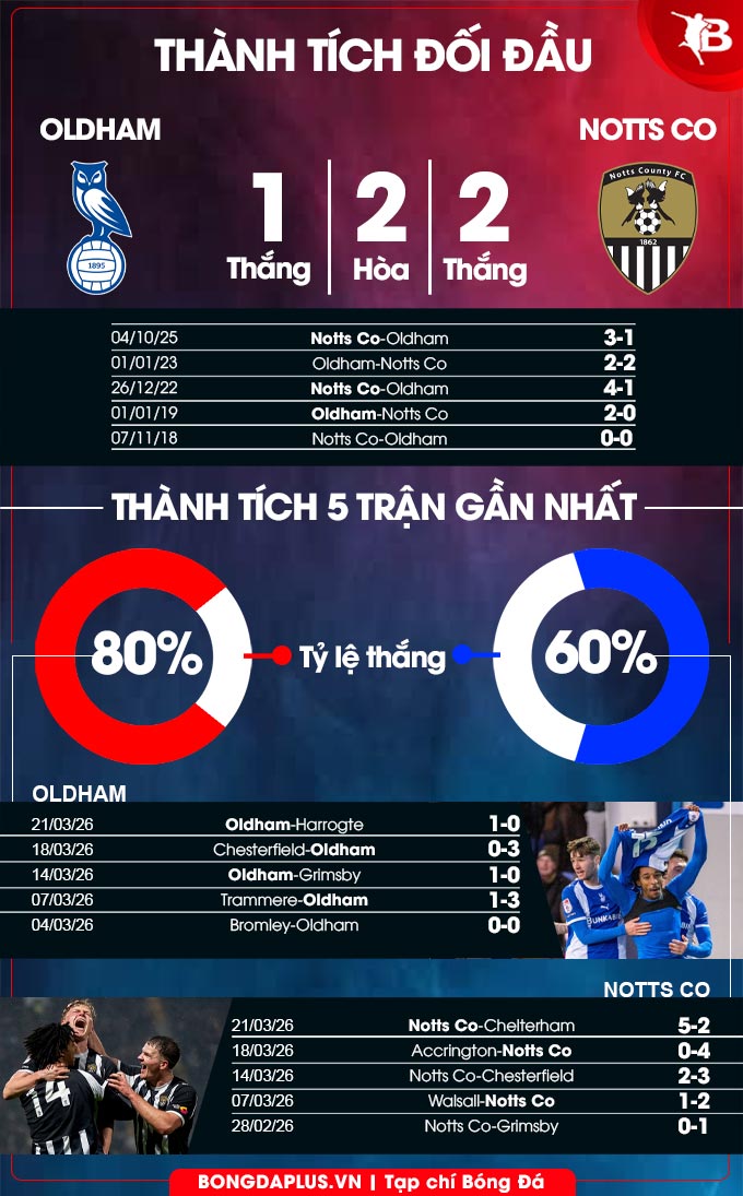 Đáng lưu ý, Notts County rất ngại khi làm khách trước Oldham Athletic. 8 trận gần nhất làm khách trước Oldham, Notts Co thua 5 và hòa 3. Do đó, nhiều khả năng, 3 điểm sẽ đến với Oldham.