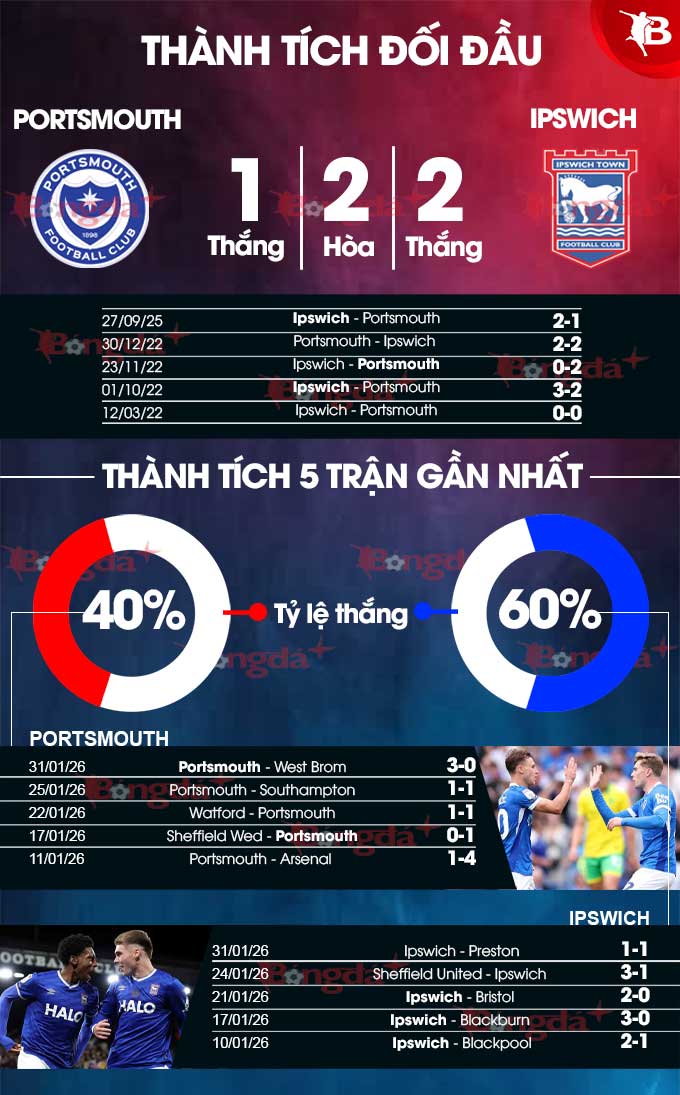 Portsmouth cũng có sự ủng hộ của quá khứ. Theo thống kê, trong 5 lần gần đây nhất tiếp đón Ipswich trên sân nhà, họ thắng 3, hòa 1, chỉ phải nhận đúng 1 thất bại. Thế nên, dù đội hình sứt mẻ đội hình, có cơ sở để tin rằng, Portsmouth sẽ có ít nhất 1 điểm trước đội khách Ipswich.