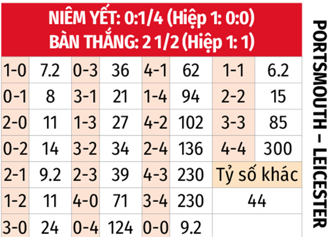 - Ít nhất 1 bàn hiệp 1: 6/7 trận gần đây của Portsmouth cùng 5/7 trận vừa qua của Leicester đều có ít nhất 1 bàn thắng trong 45 phút đầu tiên. 8/10 trận đối đầu gần nhất cũng có tối thiểu 1 lần lưới rung trước giờ nghỉ. Bởi thế, có thể chờ tổng bàn thắng hiệp 1 về 3/4 để cổ vũ mưa bàn thắng.