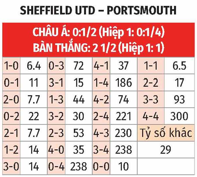 - Chẵn bàn thắng: 4/5 trận gần nhất của Sheffield United có tổng bàn thắng chia hết cho 2. Ngoài ra, 3/4 trận vừa qua của Portsmouth đều chứng kiến điều tương tự.