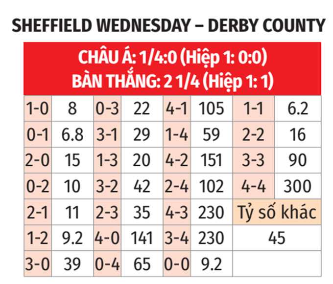 - Sheffield Wednesday thắng theo châu Á: Derby County đang tỏ ra kém duyên với chuỗi 3 trận thua liên tiếp theo châu Á. Ngoài ra, họ cũng thua theo châu Á ở 5/6 trận gặp Sheffield Wednesday gần đây nên không phải là sự lựa chọn đáng tin cậy.