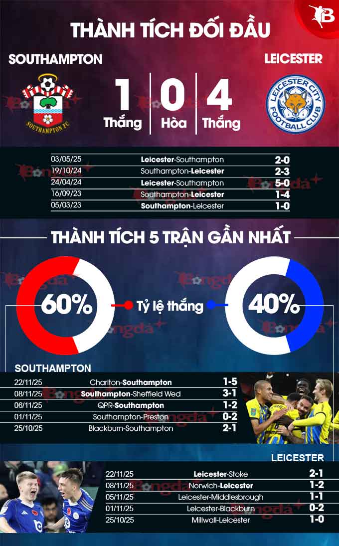 - Nhiều bàn thắng: 5/6 trận gần đây của Southampton cùng 2 trận liên tiếp vừa qua của Leicester đều có từ 3 bàn thắng trở lên. 6/8 trận đối đầu gần nhất cũng xuất hiện tối thiểu 3 pha làm bàn.