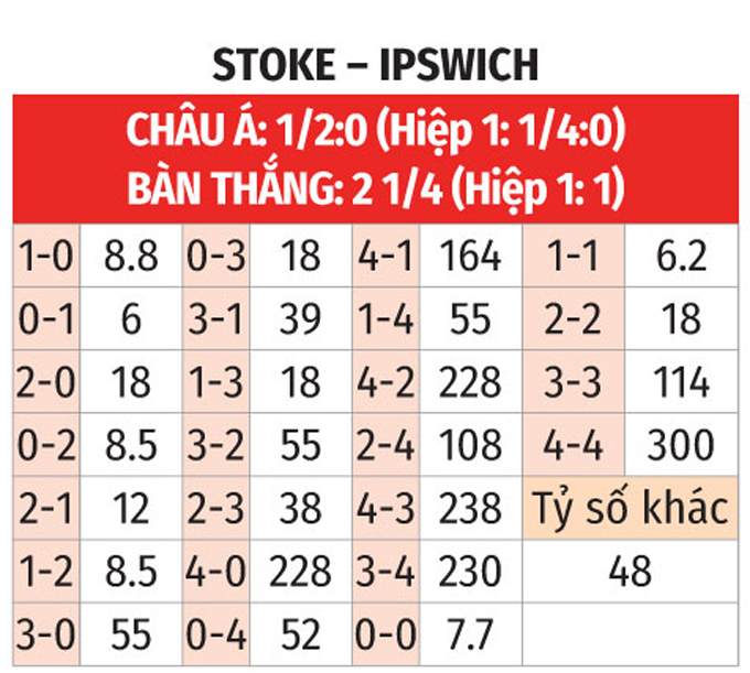 - Chẵn bàn thắng: 6/8 trận gần nhất giữa 2 CLB có tổng bàn thắng chia hết cho 2. Chưa hết, 7/10 trận sân khách vừa qua của Ipswich cũng chứng kiến điều tương tự. Ngoài ra, 5/7 trận đã qua khi Stoke tiếp Ipswich trên sân nhà có tổng bàn thắng là số chẵn.