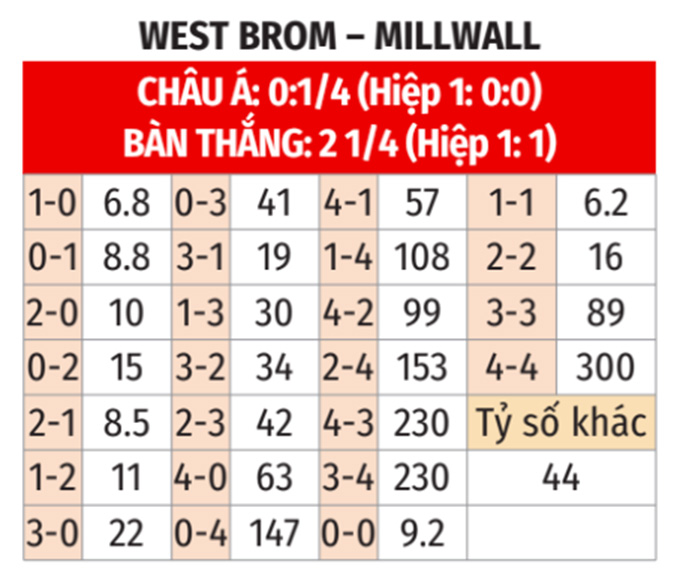 Trên sân nhà, West Brom cũng hòa 4, thua 3, chỉ thắng 1 ở 8 trận gần đây. Vì thế, đây là cơ hội để Millwall cải thiện điểm số và nuôi hy vọng giành vị trí thứ nhì kèm suất thăng hạng Premier League mùa sau.