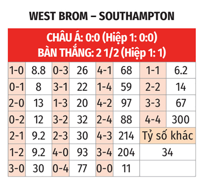 - Southampton thắng theo châu Á: Nếu như West Brom thua theo châu Á ở 5/7 trận gần nhất, thì Southampton lại thắng theo châu Á tới 6/8 trận vừa qua. Ngoài ra, Southampton còn thắng theo châu Á ở 9/11 trận gặp West Brom gần đây nên họ là sự lựa chọn đáng tin cậy.