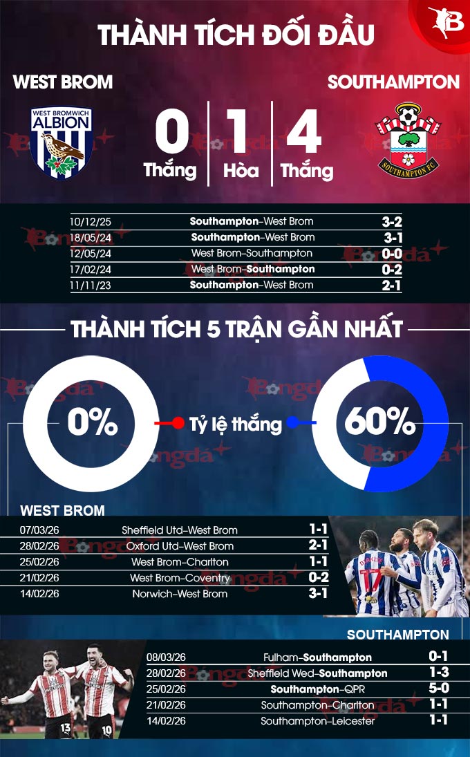 Xét về thành tích đối đầu, Southampton cũng được lịch sử hoàn toàn ủng hộ. Căn cứ vào chuyện Southampton đã thắng 4/5 trận gặp West Brom gần nhất (trận còn lại hòa), sẽ chẳng bất ngờ nếu họ được ca khúc khải hoàn sau trận đấu tới.