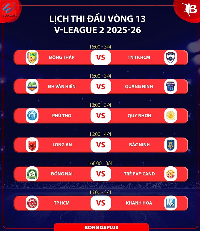 Chiều nay, vòng 13 diễn ra 3 trận đấu. Tâm điểm là cuộc đối đầu giữa Đồng Tháp và Thanh niên TP.HCM. Đây được coi là trận “chung kết ngược” khi 2 đội đang chia nhau 2 vị trí cuối bảng. Nếu chiến thắng, Đồng Tháp sẽ tạo cách biệt với đối thủ lên 5 điểm, qua đó, mở rộng cánh cửa trụ hạng. Bên kia chiến tuyến, Thanh Niên TP.HCM sẽ tiếp tục chìm sâu nếu như không giành được chiến thắng.