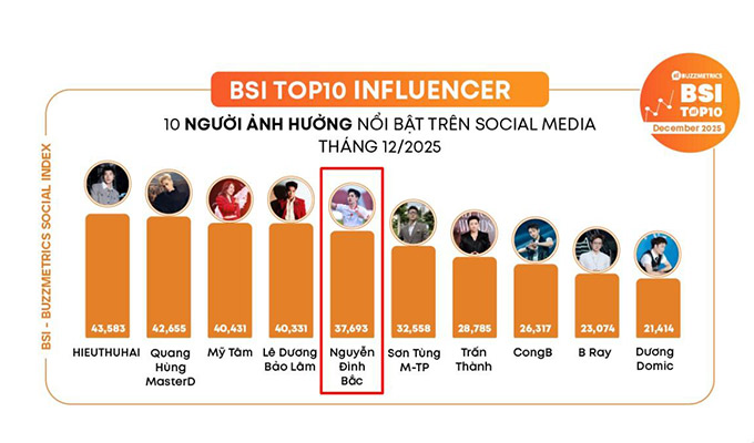 Mới đây, BuzzMetrics đã công bố danh sách 10 nhân vật có sức ảnh hưởng lớn nhất trên mạng xã hội trong tháng 12 năm 2025. Đáng chú ý, trong danh sách này có sự xuất hiện của tiền đạo Nguyễn Đình Bắc. Không chỉ góp mặt trong top 10, Đình Bắc còn đứng ở vị trí thứ 5, xếp trên nhiều nghệ sĩ giải trí nổi tiếng như Sơn Tùng M-TP, Trấn Thành, CongB, B Ray hay Dương Domic. Trong khi đó, những vị trí dẫn đầu lần lượt thuộc về Lê Dương Bảo Lâm, Mỹ Tâm, Quang Hùng MasterD và HIEUTHUHAI. Đây là điều hiếm thấy, bởi bảng xếp hạng này lâu nay thường có sự áp đảo của các gương mặt showbiz.