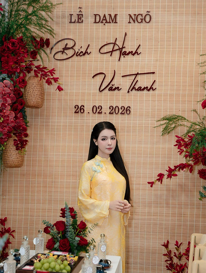 Tối ngày 21/4, hot girl Trần Bích Hạnh lần đầu hé lộ về lễ dạm ngõ được tổ chức tại tư gia nhà gái ở Nam Định từ 26/2. Lễ dạm ngõ của cặp đôi được tổ chức trong không khí ấm cúng với sự tham dự của hai bên gia đình. Buổi lễ diễn ra theo nghi thức truyền thống, thể hiện sự đồng thuận và gắn kết giữa hai gia đình trước khi tiến tới hôn nhân. Trong ngày đặc biệt, Bích Hạnh diện áo dài màu vàng còn Văn Thanh lựa chọn sơ mi xanh nhạt.