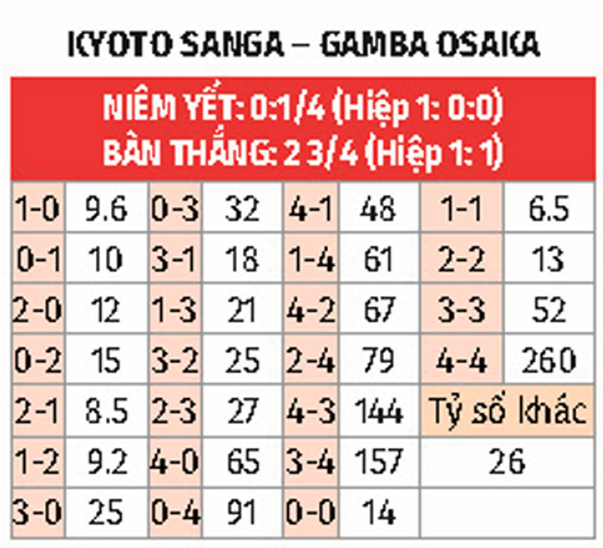 - Chẵn bàn thắng: 6/10 trận so tài gần nhất giữa 2 CLB có tổng bàn thắng chia hết cho 2. Chưa hết, 8/10 trận sân nhà mới đây của Kyoto lẫn 7/10 trận sân khách vừa qua của Gamba Osaka chứng kiến điều tương tự.