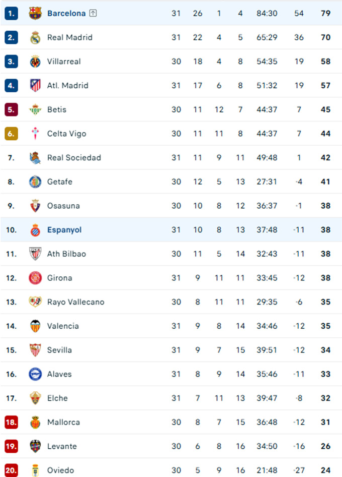 Kết quả này giúp đội chủ nhà tạm thời leo lên vị trí thứ 15 trên bảng xếp hạng La Liga. Ở một diễn biến khác, Barcelona đã dễ dàng đánh bại Espanyol với tỷ số 4-1 để xây chắc ngôi đầu. Thầy trò Hansi Flick tạm thời hơn Real Madrid 9 điểm.