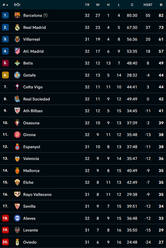 Sự thiếu vắng Yamal cũng khiến các đợt tấn công mà đội chủ nhà tạo ra thiếu hẳn độ sắc bén, bất chấp còn đó những Rashford, Fermin Lopez, De Jong. Thắng 1-0 chung cuộc, Barcelona củng cố vững chắc ngôi đầu bảng La Liga (82 điểm/32 trận), hơn đội xếp sau Real Madrid 9 điểm.