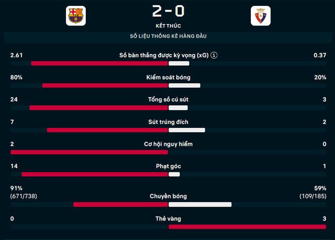 Có bàn giải tỏa thế bế tắc, Barcelona càng chơi càng hay. Phút 86, họ có bàn nhân đôi cách biệt. Kounde thoát xuống đáy biên và chuyền bóng ngược lại. Catena phía Osasuna cố gắng truy cản nhưng lại vô tình trở thành đường kiến tạo, khi anh đưa bóng đến đúng vị trí mà Raphinha chờ sẵn. Ngay lập tức, Raphinha đệm bóng vào lưới để ấn định thắng lợi 2-0 cho CLB xứ Catalunya.