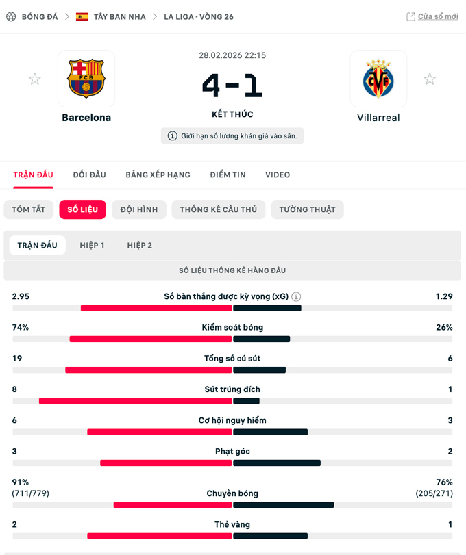 Đến phút 90+1, Lewandowski ghi bàn ấn định chiến thắng 4-1 dành cho đội chủ nhà. Kết quả này giúp Barca tạm nới rộng cách biệt với Real Madrid lên thành 4 điểm trên bảng xếp hạng La Liga.