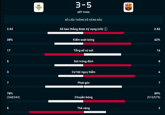 Phút 85, Llorente ghi bàn, rút ngắn cách biệt xuống còn 2-5 cho Betis. Hàng thủ Barca tiếp tục mắc sai lầm, nhờ đó mà Cucho Hernandez thực hiện thành công quả phạt đền vào phút 90. Dù vậy, đó cũng là tất cả những gì Betis có thể làm trước đội đầu bảng La Liga. Chung cuộc, Betis thua 3-5 trước Barca.