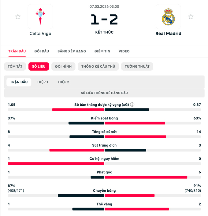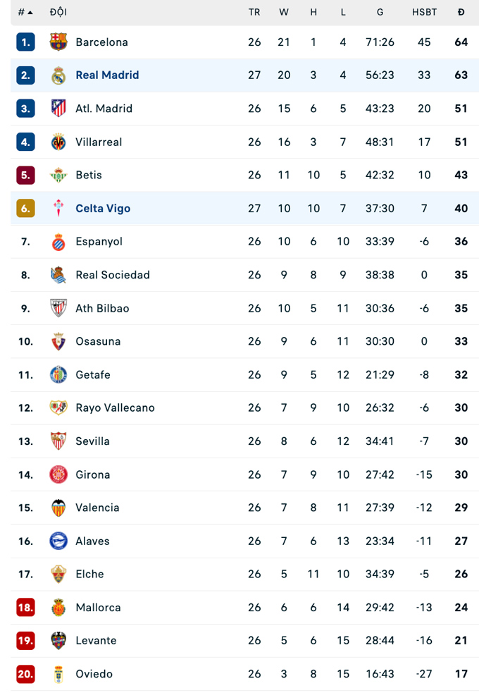 Với kết quả này, Los Blancos có 63 điểm sau 27 trận, kém đội đầu bảng Barca đúng 1 điểm nhưng đang đá nhiều hơn đối thủ 1 trận.