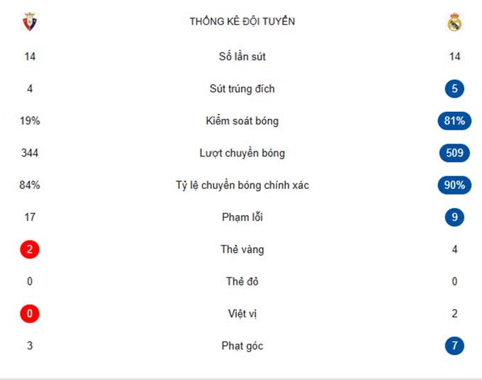 Pha dứt điểm cận thành của Vinicius sau đường căng ngang của Valverde tưởng như sẽ tạo tiền đề để Real lội ngược dòng. Nhưng rồi kịch bản này đã không xảy ra. Ngược lại, Osasuna dù phải gồng mình chống đỡ những đợt tấn công của Real nhưng lại là những người được hưởng niềm vui chiến thắng.