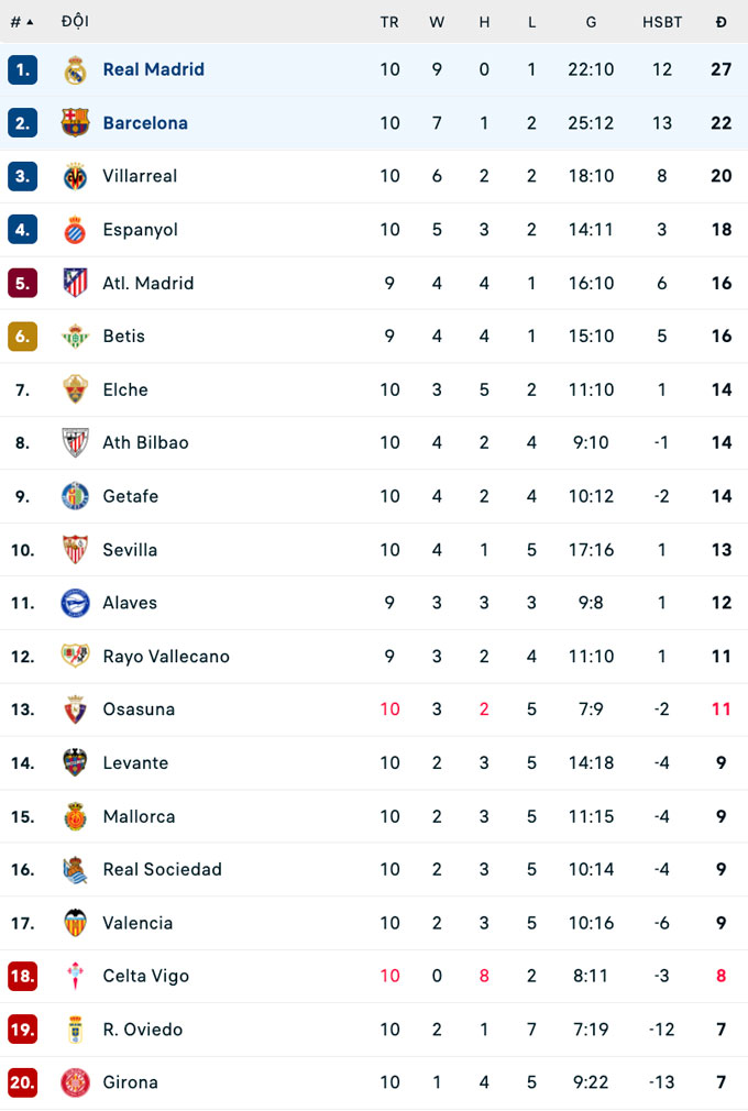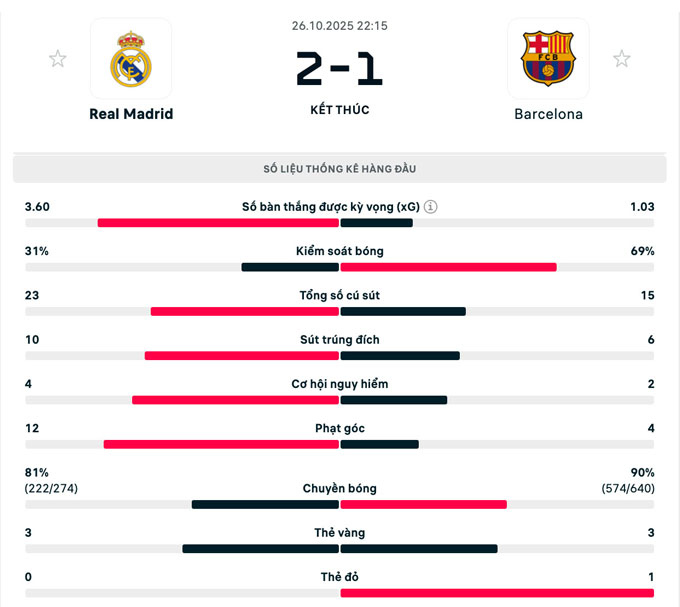 Trận đấu kết thúc với tỷ số 2-1 nghiêng về phía Real. Đội bóng thành Madrid đảm bảo vững chắc ngôi đầu với 5 điểm nhiều hơn Barca.