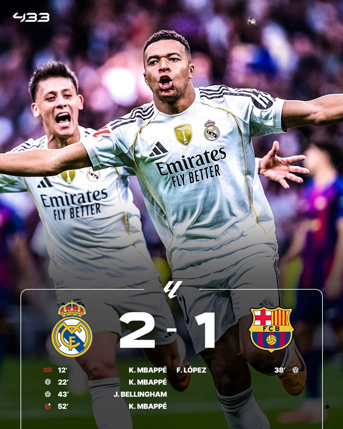 Real Madrid: Mbappe (22'), Bellingham (43')