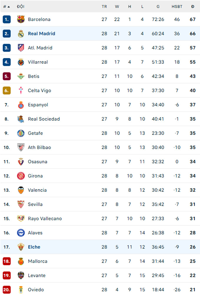 Kết quả này giúp Los Blancos tiếp tục kiên trì bám đuổi đội đầu bảng Barca tại La Liga. Hiện tại, thầy trò HLV Alvaro Arbeloa sở hữu 66 điểm, kém Barca đúng 1 điểm nhưng chơi hơn một trận.