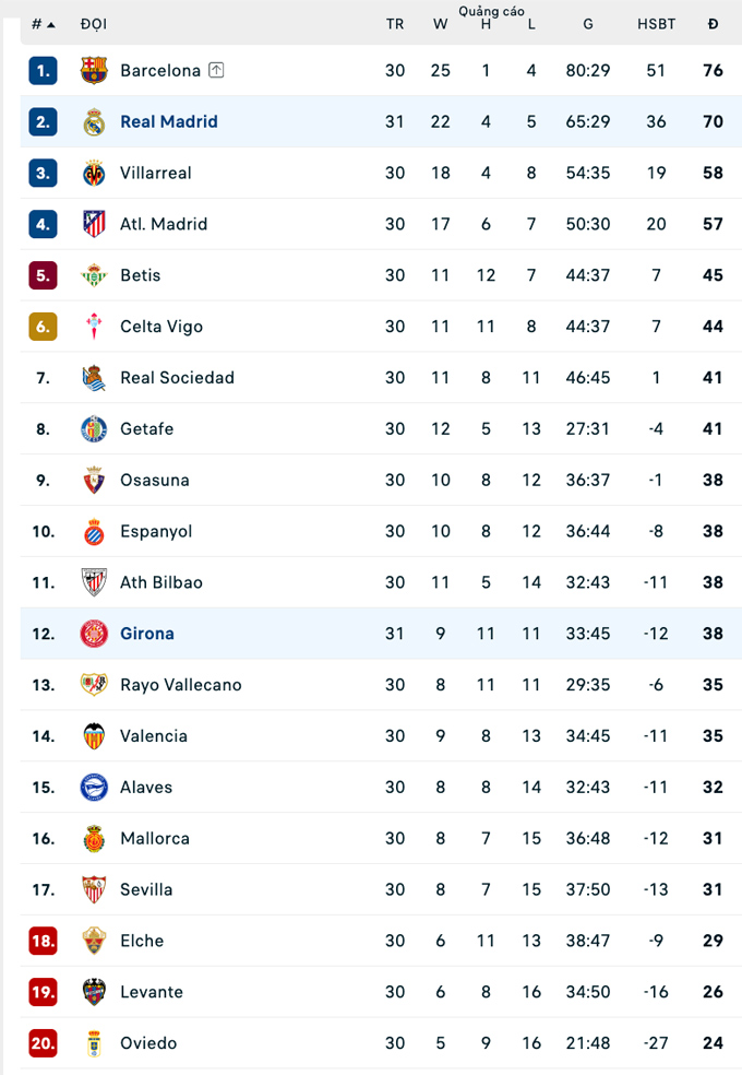 Trước khi Barca ra sân vào đêm thứ Bảy gặp Espanyol, Real có cơ hội rút ngắn khoảng cách xuống còn 4 điểm. Tuy nhiên, thầy trò HLV Alvaro Arbeloa lại không thể tận dụng, qua đó đứng trước nguy cơ bị đối thủ bỏ xa tới 9 điểm nếu Barca giành chiến thắng.