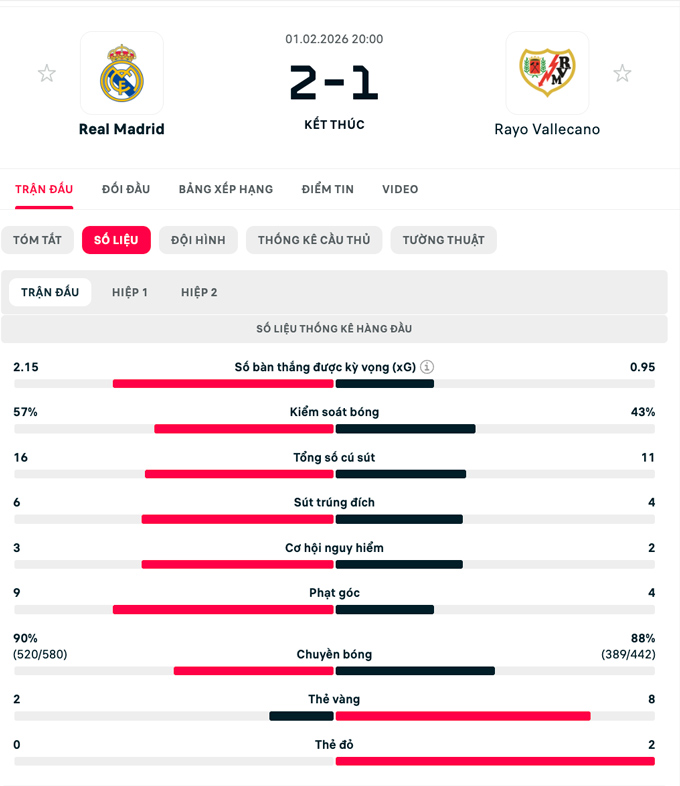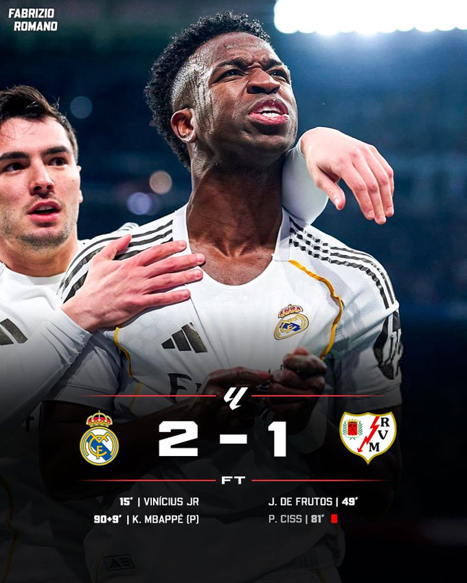 Phút 90+8, Nobel Mendy phạm lỗi với Brahim Diaz trong vòng cấm. Trọng tài cho Real hưởng phạt đền và Mbappe đã không bỏ lỡ cơ hội để ghi bàn, ấn định chiến thắng 2-1 cho đội chủ nhà. Đáng chú ý là tới phút 90+14, Vallecano còn có thêm 1 cầu thủ nữa bị đuổi khỏi sân khi Chavarria nhận thẻ vàng thứ hai.