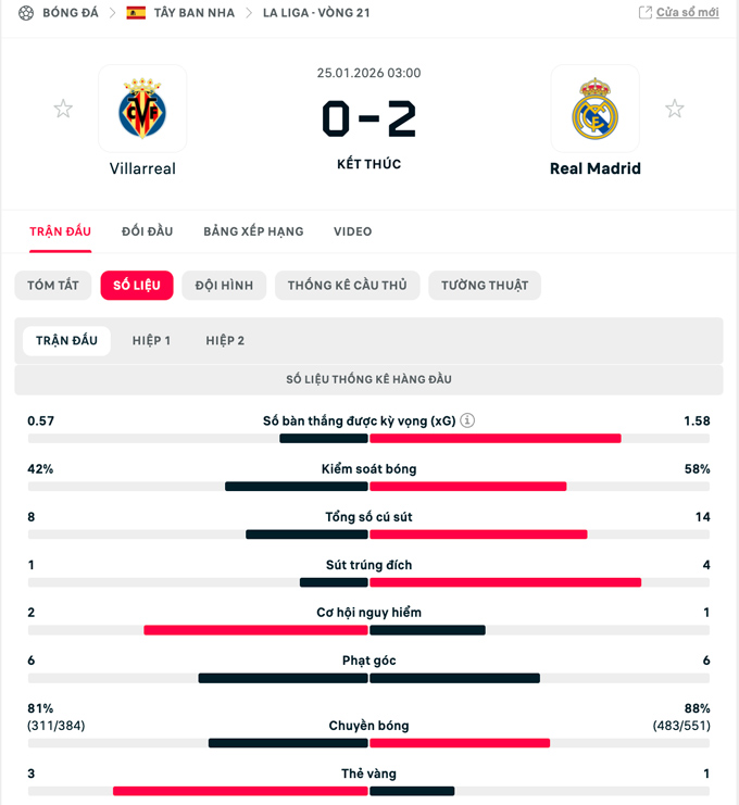 Trận đấu giữa Villarreal vs Real Madrid tại vòng 21 La Liga 2025/26 đã kết thúc với tỷ số 2-0 nghiêng về phía đội khách. Kylian Mbappe ghi cả 2 bàn giúp Los Blancos tạm đòi lại ngôi đầu trước khi Barca ra sân.