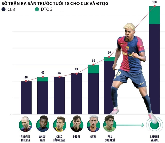 Ở tuổi 18, Yamal đã phải ra sân liên tục cho cả Barca lẫn đội tuyển Tây Ban Nha. Theo thống kê thì trước sinh nhật lần thứ 18, Yamal đã có 130 lần ra sân cho CLB và ĐTQG. Tổng cộng, số phút thi đấu là 8.158 phút.