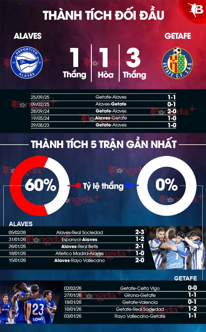 Nếu nhìn vào thành tích đối đầu thì có thể khẳng định Alaves và Getafe quả là kỳ phùng địch thủ. Hai đội bóng này thường xuyên hòa nhau, nên nếu mỗi bên có được 1 điểm từ trận đấu tới thì cũng không phải chuyện lạ.